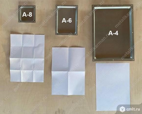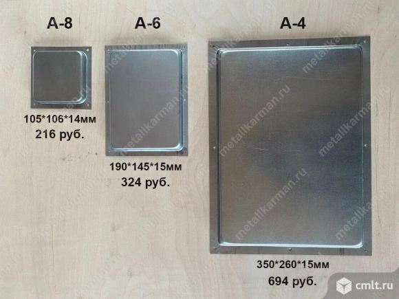Доставка по РФ транспортными компаниями. Металлический карман предназначен для защиты сопроводительных документов (упаковочного листа). Штампованный оцинкованный Формат А-8 (105*106*14 мм) - 216 руб. Штампованный оцинкованный №1 ГОСТ 24634-81 Формат А-7 (145*110*15 мм) - 324 руб. Штампованный оцинкованный №2 ГОСТ 24634-81 Формат А-6 (190*145*15 мм) - 324 руб. Штампованный оцинкованный Формат А-4 (350*260*15 мм) - 694 руб. Возможно изготовление по индивидуальным размерам заказчика. Минимальная партия заказа - 20 шт. Скидки при заказе на сумму от 50 000 руб. 07.11.2024 08:01