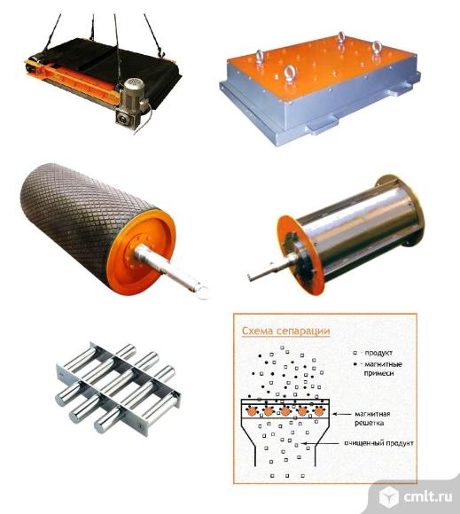 Железоотделители на постоянных магнитах : подвесные, саморазгружающиеся (с автоматической очисткой), шкивные (магнитные барабаны, валки), трубные (решетки, сепараторы).